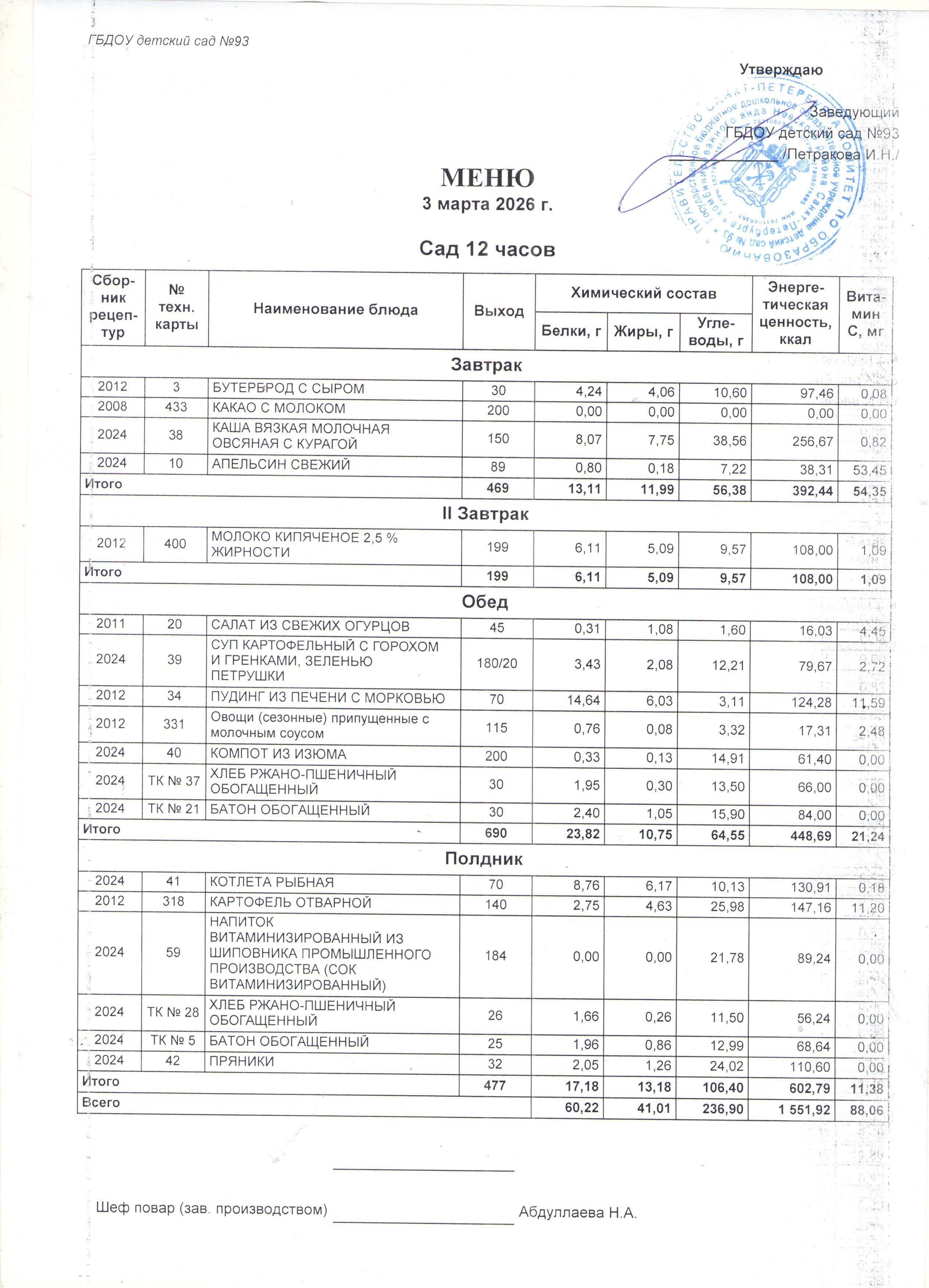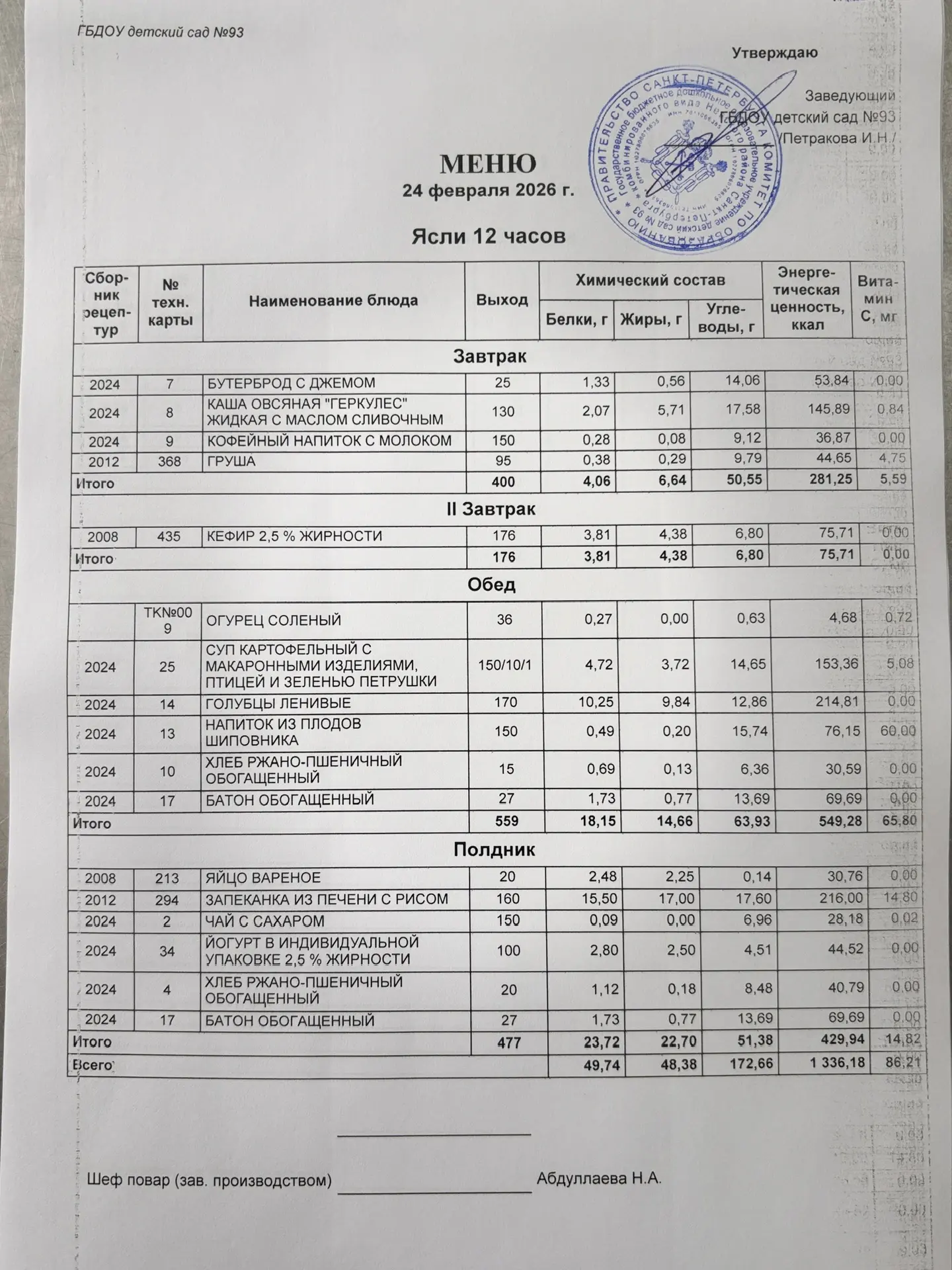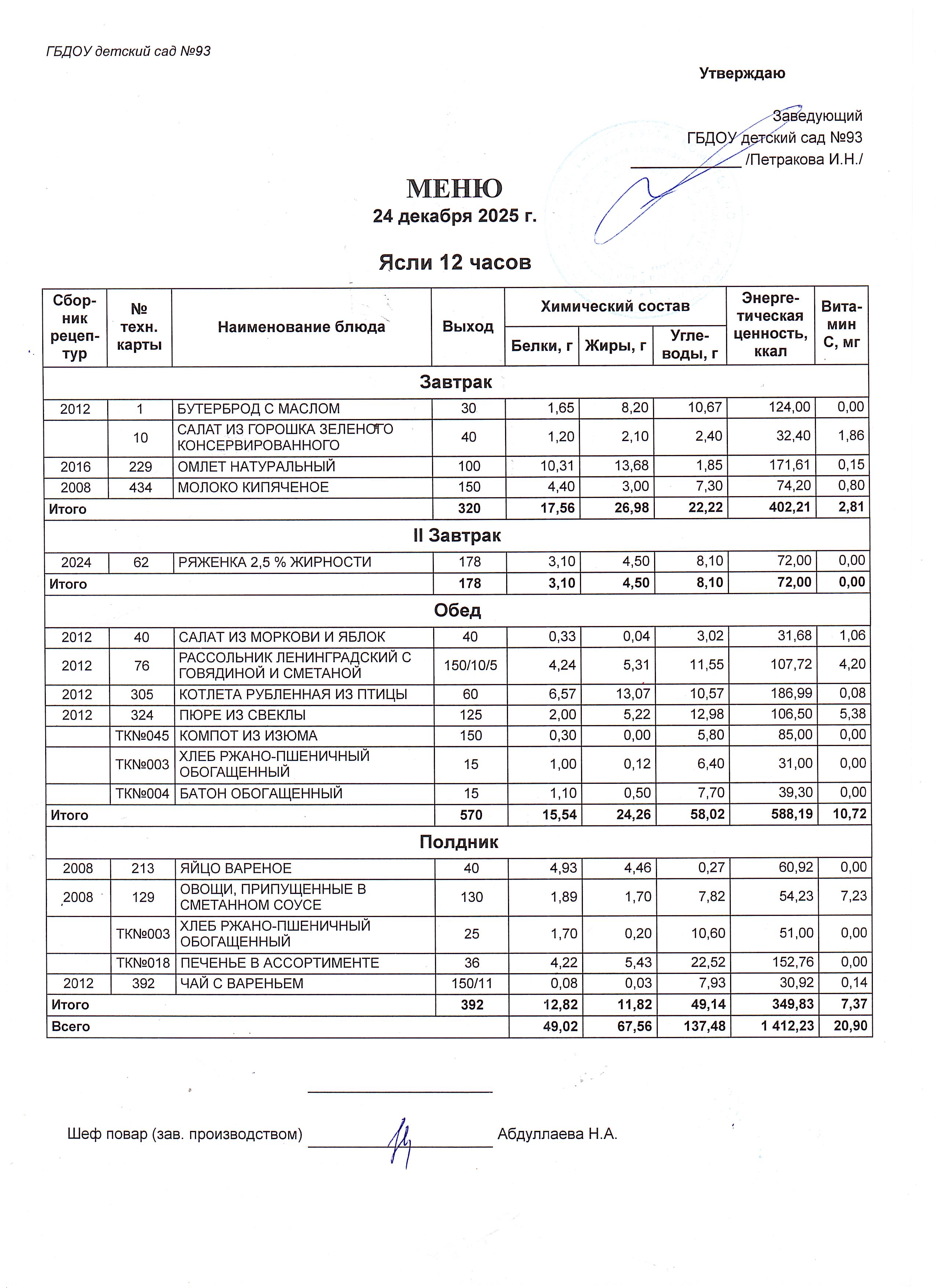 В детском саду организованно ежедневное, четырехразовое горячее питание. Разработано на основе цикличноо десятидневноо меню, в соответствии с санитарно-эпидемиологическими правилами и нормативами (САНПИН 2.3/2.4.3590-20), благодаря которому ежедневный рацион стал более разнообразным, сбалансированным, рациональным. В меню включены: мясо, фрукты, овощи, рыба, кура, широко представлены молочные продукты.
