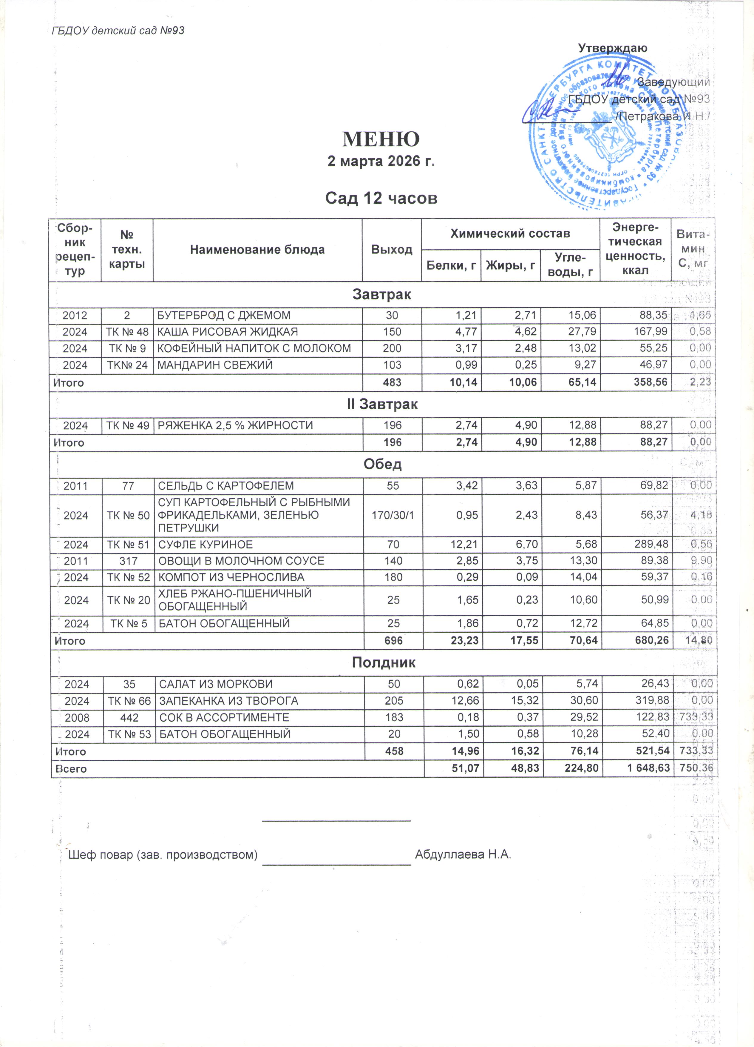 В детском саду организованно ежедневное, четырехразовое горячее питание. Разработано на основе цикличноо десятидневноо меню, в соответствии с санитарно-эпидемиологическими правилами и нормативами (САНПИН 2.3/2.4.3590-20), благодаря которому ежедневный рацион стал более разнообразным, сбалансированным, рациональным. В меню включены: мясо, фрукты, овощи, рыба, кура, широко представлены молочные продукты.